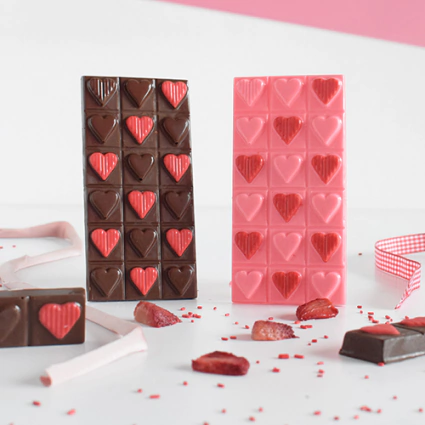 Set de 2 moldes placas, para crear tableta y tableta bombón de corazones lisos y rayados en chocolate.¡Ideales para rellenar con pastas saborizadas o dulce de leche!Incluye: