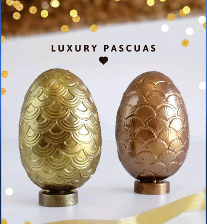 2 Moldes Placas para crear huevo de chocolate texturado motivo “ostras” en un tamaño de 15 cm.
